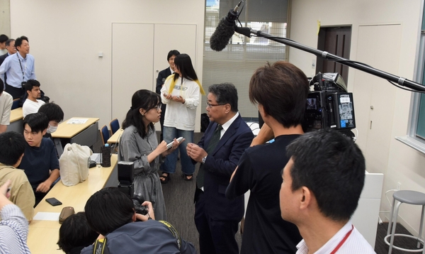 講義後に行われたメディアの囲み取材では、「楽しそうに講義を聞いてくれる学生もいて、講義はやはり面白い」と話し、「私は新聞記事で新たな事柄に触れ、それが幸運につながった。ネットニュースは本人が興味のありそうな事柄ばかりが表示され、広がりがなくなる。ぜひ、新聞を読んでもらいたい」と学生たちに注文も付けました。
