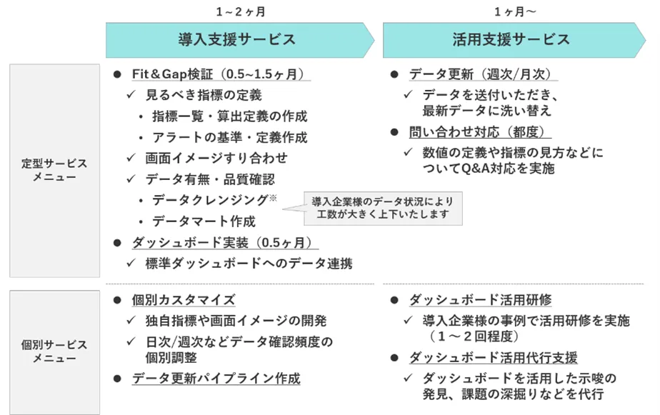 導入後は定期的なデータ更新(月次~週次)やQ&A対応をサポートします。また、追加サービスとして、社内定着化に向けた研修開催やダッシュボード活用代行支援も提供可能です。