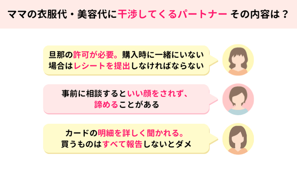 ママ自身の衣服代や美容代に関して、パートナーから「干渉されない」が大半を占めた今回のアンケート結果。しかし一方で、少数ながらもパートナーからの制限を感じているママがいることもわかりました。