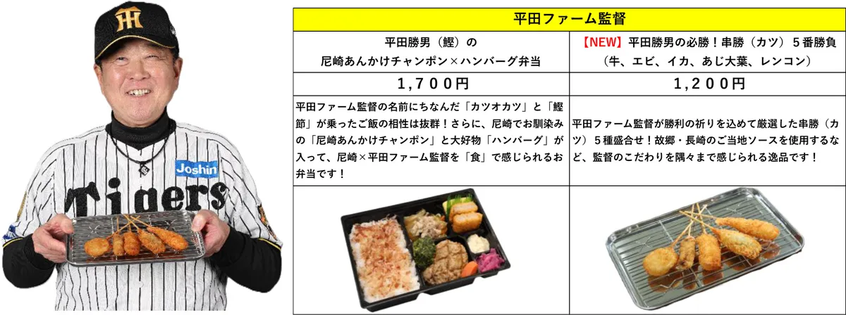 ※「平田勝男(鰹)の尼崎あんかけチャンポン×ハンバーグ弁当」は3月7日(土)対ソフトバンク戦から、「平田勝男の必勝!串勝(カツ)5番勝負」は2月28日(土)ファーム練習スタンド開放から発売します。