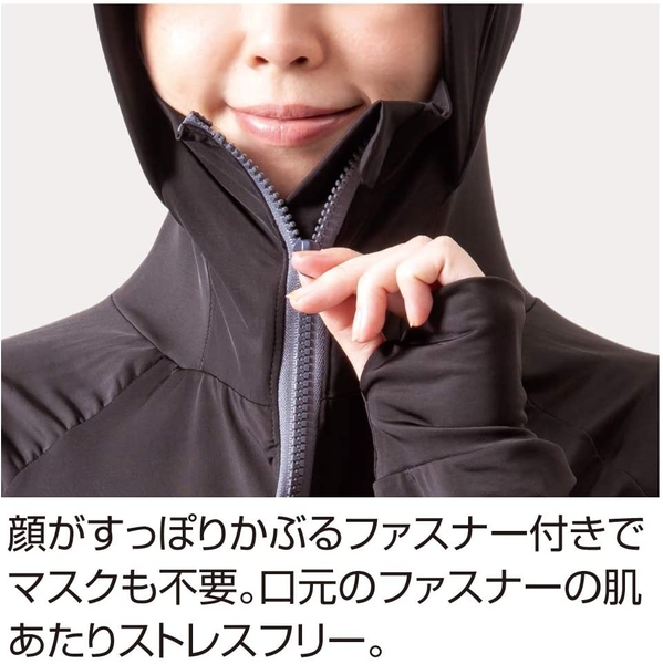 ・顔がすっぽりかぶるファスナー付きでマスクも不要。