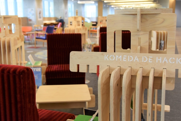 スリット家具は、コメダの赤いソファの縦縞模様から着想を得て、愛知県産のヒノキの合板を使用して製作。釘も使わず組み上げられ、持ち運び可能な仕様のため、コメダを感じられる空間をどこでも作り出すことができます。宮﨑絢子さん(建築学科3年)は「重量も考慮し、くり抜ける部分はくり抜き、その部分を使ってガジェットを作り、無駄なく使用することで環境への配慮も意識しました」。また、スリット家具の上部に付けた小さなテーブルを含めた高さは、コメダ店舗の低く設定された間仕切りと同じ高さに揃えたといい、「コメダの特徴を守りつつ、それぞれの方が過ごしやすいようにカスタマイズしてもらえたら」と話しました。二村洸生さん(理工学研究科修士1年)は「座るだけがくつろぎではなく、立っている人と座っている人でコミュニケーションが生まれたり、くり抜いた部分から新たなコミュニケーションが生まれたりしたら面白い」と設計の意図を説明しました。