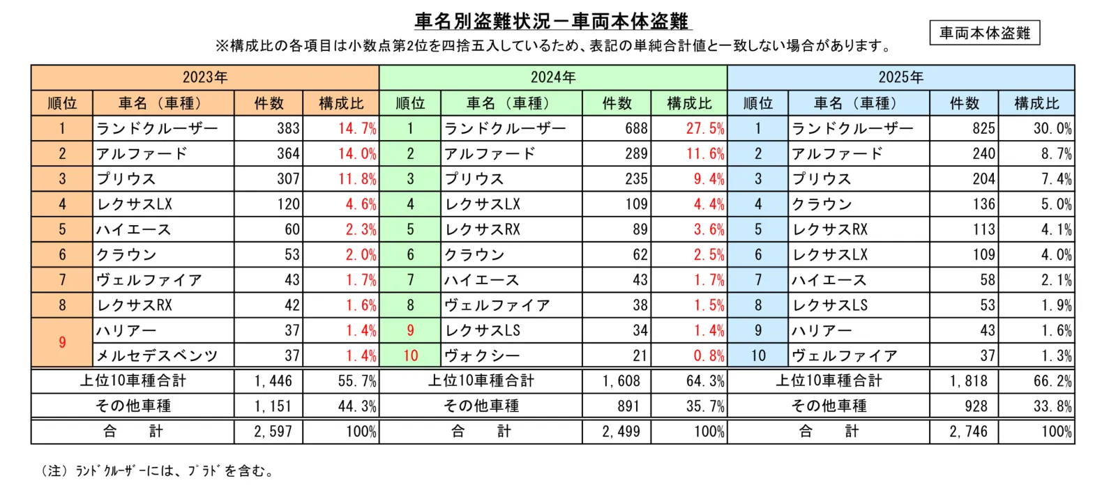 ・2025年の車両本体盗難の車名別盗難状況のワースト1は、5年連続でランドクルーザーとなった。また、車上ねらいの車名別盗難状況でもワースト1となり、ランドクルーザーの盗難被害が突出している。