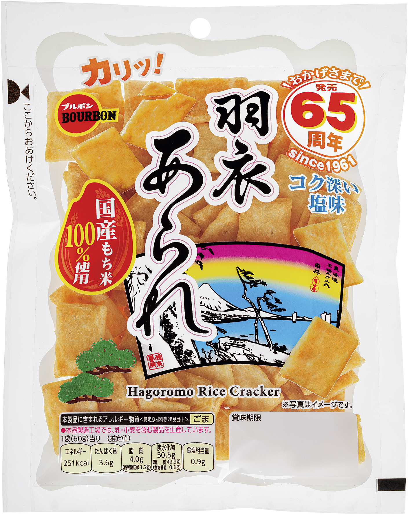 株式会社ブルボン(本社:新潟県柏崎市、代表取締役社長:吉田 匡慶)は、国産もち米を使用した「羽衣あられ」が発売65周年を迎えるにあたり、特別ロゴを付けたパッケージにリニューアルいたします。