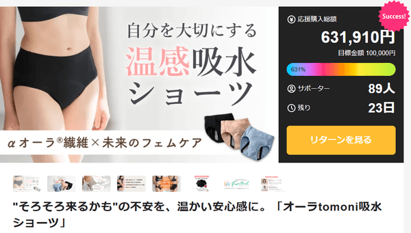 11月12日にMakuakeで先行発売を開始した「オーラtomoni吸水ショーツ」は、開始から1日で目標金額の500%を突破。その後も応援購入が伸び続け、想定を大きく上回る反響となっています。