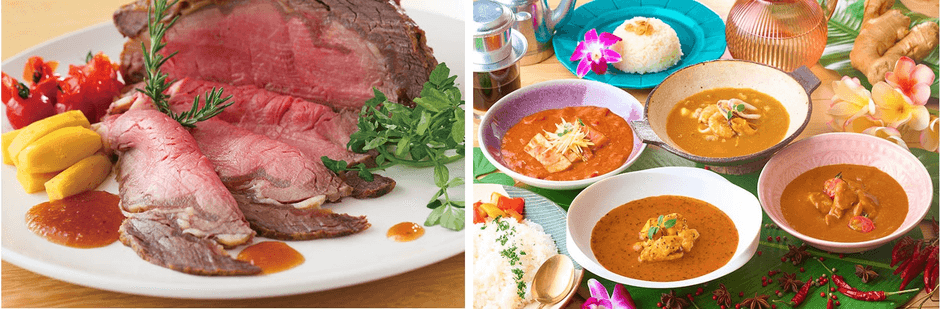 左:低温でじっくりと火入れした後、余熱でゆっくり火を通した大江戸温泉物語自慢のローストビーフ。特製ソースと西洋わさびのクリームを添えてお楽しみください。