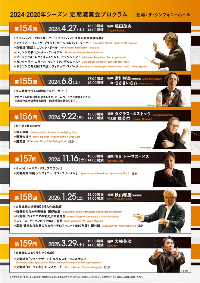 日本で最も長い歴史と伝統を誇る交響吹奏楽団「Osaka Shion Wind Orchestra(略称:Shion)」を有する公益社団法人大阪市音楽団(本社:大阪市住之江区/理事長:石井徹哉)は、2024-2025年のシーズンラインナップを発表しました。本年も作曲者自らが指揮を務める演奏会から、巨匠や名匠の出演と、彩り豊かな定期演奏会を6公演。50周年アニバーサリーとなる宇宙戦艦ヤマトの特別なプログラムでは、豪華ゲストを迎えます!