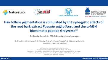 このたび、当社、およびMonasterium Laboratory※1、株式会社ネイチャーラボの3者で実施した白髪に関する共同研究成果を、第12回世界毛髪研究会議(WCHR※2)で発表しました。