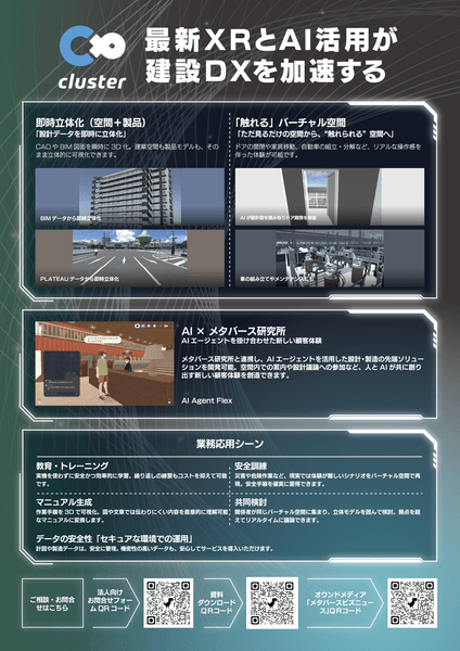 また、会期中の3日間、クラスター社のブースでは鹿島建設をはじめとする、様々な業界との建設・産業DX領域での共創事例のデモを用意しております。「3D空間を使ったAI・デジタルツイン・遠隔協働(シミュレーション)―インダストリアルメタバースで現場と経営をつなぐ」をテーマに、クラスターが持つ独自のメタバース技術や産業DX領域で培ってきた知見について、わかりやすくご説明いたします。