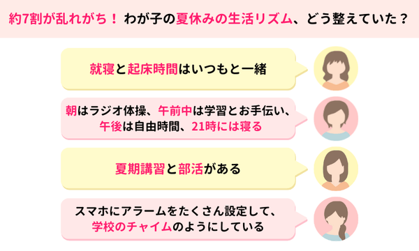 学童や部活、夏期講習など、決まった時間に外出する予定が生活リズム維持に効果的だったという声も多く寄せられました。