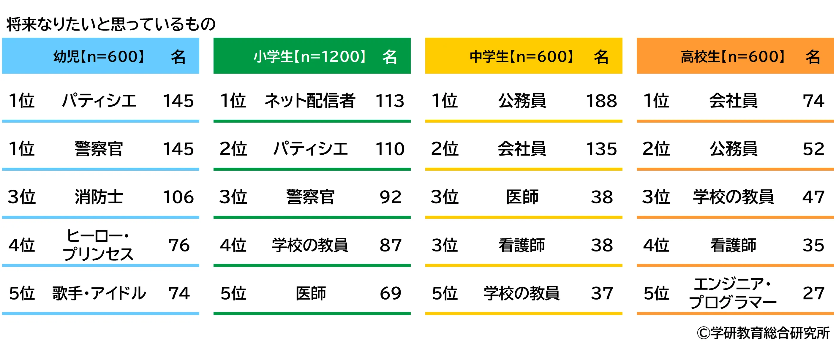 学研教育総合研究所調べ 将来つきたい職業TOP3 幼児では「パティシエ」「警察官」「消防士」、 小学生では「ネット配信者」 「パティシエ」「警察官」、 中学生では「会社員」「公務員」「学校の教員」、 高校生では「会社員」「公務員」「学校の教員」