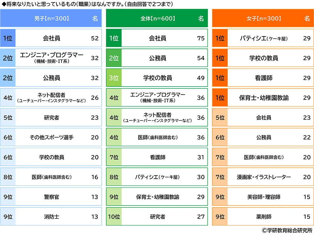 女子では1位「パティシエ」「学校の教員」「看護師」「保育士・幼稚園教諭」