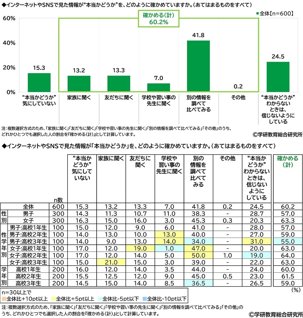 インターネットやSNSで見た情報が“本当かどうか”を、どのように確かめているかをきいたところ、確認する方法では「別の情報を調べて比べてみる」(41.8%)が最も高くなりました。そのほか、「家族に聞く」(13.2%)、「友だちに聞く」(13.3%)にも回答がみられました。また、「“本当かどうか”気にしていない」は15.3%、「“本当かどうか”わからないときは、信じないようにしている」は24.5%で、「確かめる(計)」は60.2%でした。