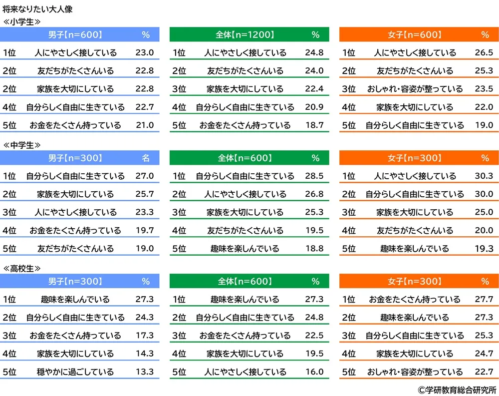 ★将来、どのような大人になりたい? 男子1位「自分らしく自由に生きている」、女子1位「人にやさしく接している」