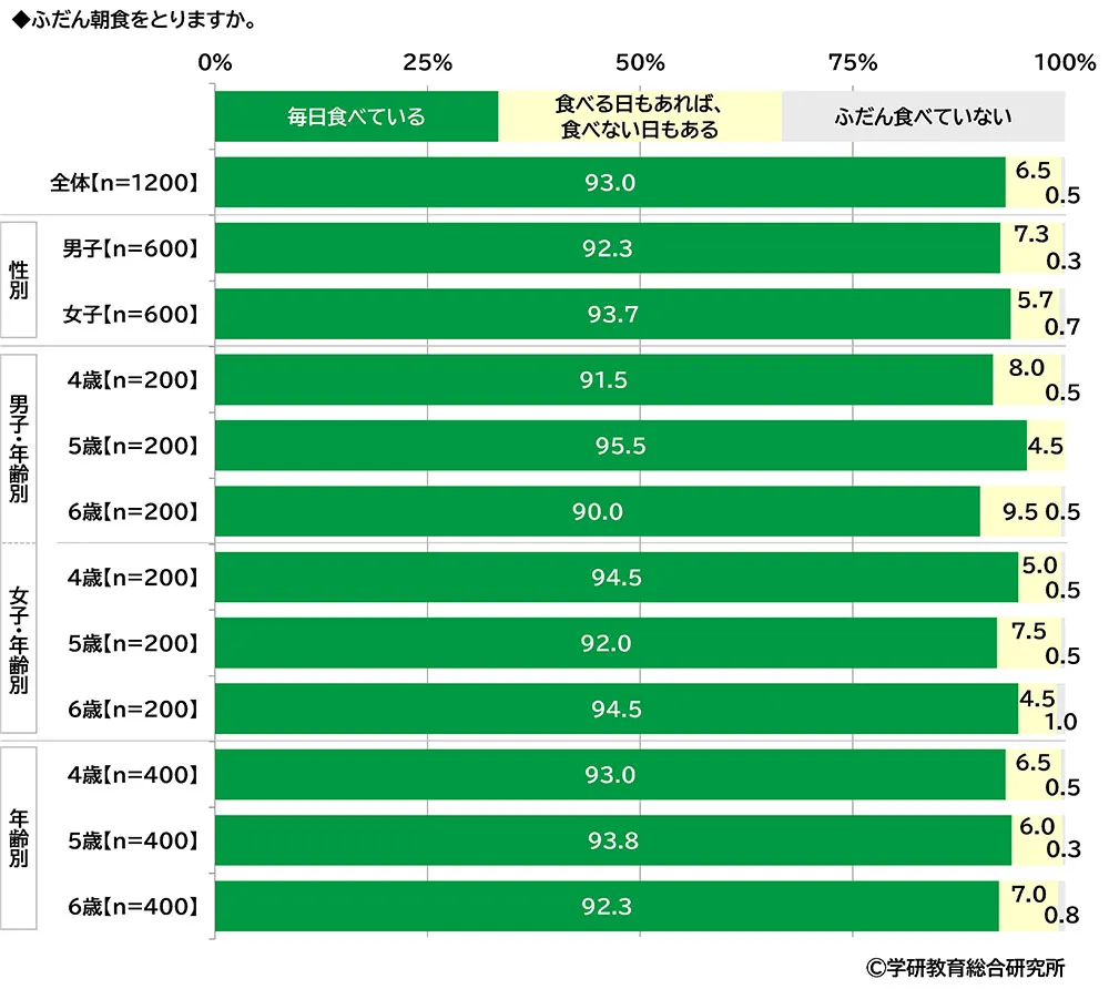 ふだん朝食をとるかをきいたところ、「毎日食べている」が93.0%、「食べる日もあれば、食べない日もある」が6.5%、「ふだん食べていない」が0.5%となり、大多数が朝食を毎日食べていることがわかりました。