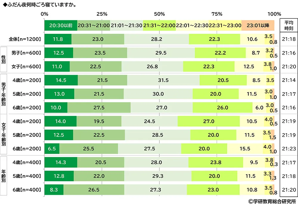 男女・年齢別にみると、最も遅かったのは6歳の女子で、平均時刻は21:23となりました。