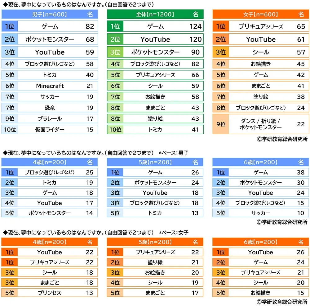 男女別にみると、男子では1位「ゲーム」、2位「ポケットモンスター」、3位「YouTube」、女子では1位「プリキュアシリーズ」、2位「YouTube」、3位「シール」となり、「YouTube」が男女ともにTOP3に挙がりました。
