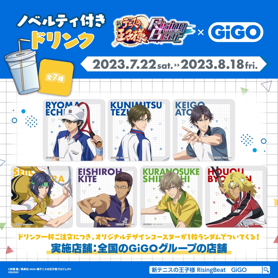 株式会社GENDA GiGO Entertainment(本社:東京都港区 代表取締役社長:二宮 一浩 以下当社)は GiGOグループのお店におきまして、株式会社ブシロード(本社:東京都中野区、代表取締役社長:木谷高明)制作のスマートフォン向けゲーム『新テニスの王子様 RisingBeat』の大型ップデートに合わせた様々なコラボレーションからなるキャンペーンを2023年7月22日(土)より開催致します。