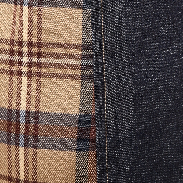 ・後ろ身頃とポケット口に、デニムの切り替えを入れました。大胆な切り替えのデザインはインパクトがあり、一枚でラフにおしゃれを楽しめます。