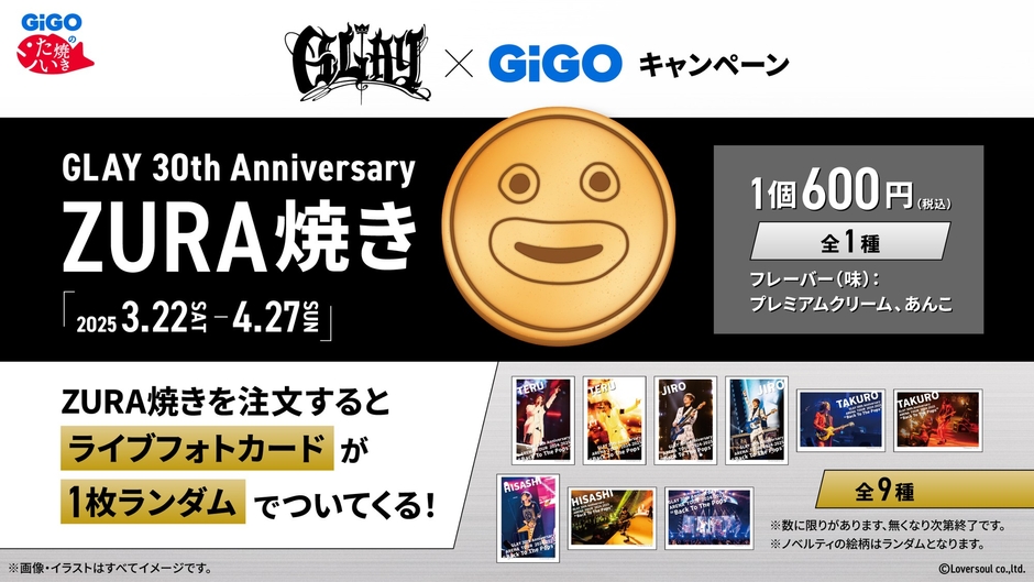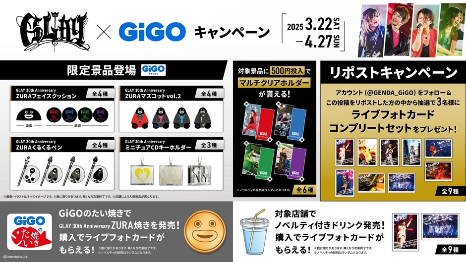 株式会社GENDA GiGO Entertainment(本社:東京都港区 代表取締役社長:二宮 一浩 以下、「当社」)は、GiGOグループのお店におきまして2025年3月22日(土)より、2025年4月に30周年記念ベストアルバムを2タイトル同時リリースする人気ロックバンド『GLAY』とのコラボレーションキャンペーンを開催いたします。