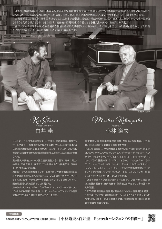 92歳を迎えた、日本音楽会が誇る鍵盤楽器奏者、小林道夫。氏が信頼し、他方では氏を尊敬してやまない、元NHK響ゲストコンサートマスターのヴァイオリニストの白井圭。両者が昨年の共演の後、早く再共演をと願い実現するコンサート。