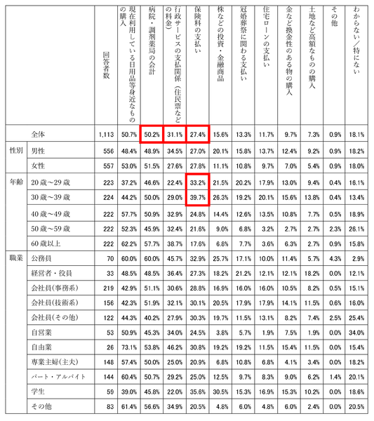 ・また、「保険料の支払い」の回答も27.4%と少なくない水準。特に、20代・30代では3割を超える結果となった。口座振替やクレジットカード引落が一般的な保険料支払いにおいても、スマホ決済の重要性が高まっていることが窺える。