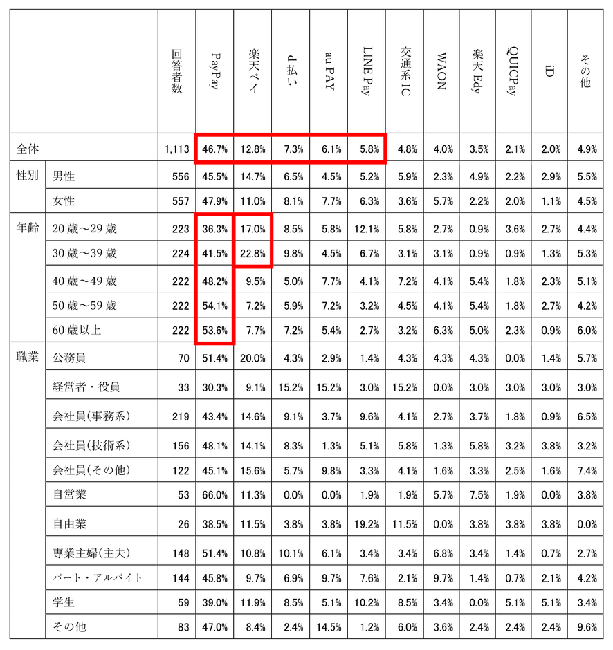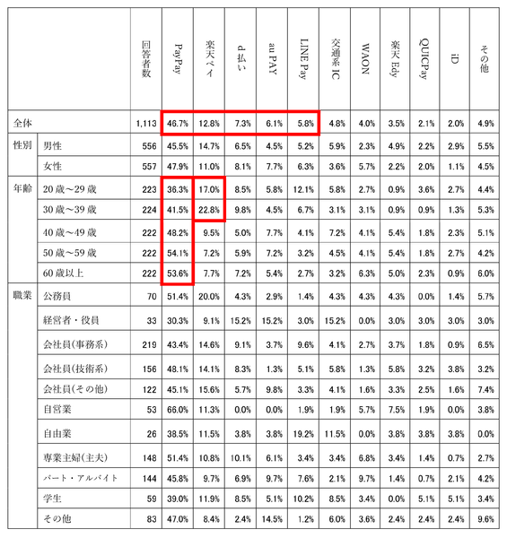 ・年齢別では、20代・30代で楽天ペイの利用が多かった。