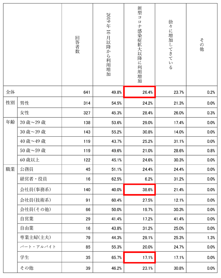 ・スマホ決済の利用を「増加した」「やや増加した」とした回答者のうち、26.4%が新型コロナウイルス感染症の拡大以降を増加時期として選択。このうち、職業別では会社員(事務系)が38.6%と最多回答となった一方、学生が17.1%と低い数字となった。