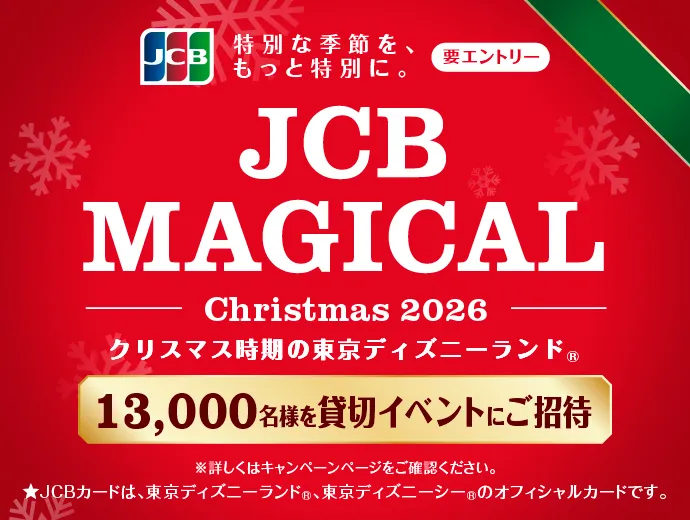「JCB マジカル クリスマス 2026」とは、東京ディズニーランド(R)や東京ディズニーシー(R)をJCBカードの会員の皆様だけで、特別に楽しめる貸切イベントです。パークを思い切り堪能できるスペシャルな夜に抽選でご招待します。