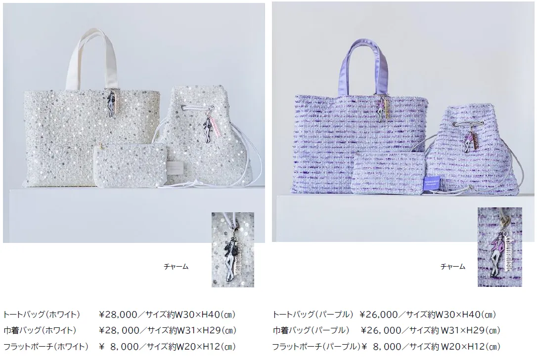 今回のコラボレーションは、宝塚歌劇の華やかな舞台衣装をイメージさせるパールやスパンコールをあしらったホワイトのツイード生地と、宝塚らしい“すみれの花”をイメージした優雅なパープルツイード生地の2種を展開。トートバッグ、巾着バッグ、フラットポーチの各3アイテムをラインアップしました。バッグ2型には宝塚歌劇ならではの男役型スペシャルチャームが付属、よりタカラヅカ感を添えます。巾着型は和装にも洋装にも合い、トート型はサブバッグとしても使えます。観劇にはもちろん、その他オケージョンや、普段のコーディネートの上品なアクセントとして幅広いシーンで活躍する特別なコレクションをぜひお楽しみください。