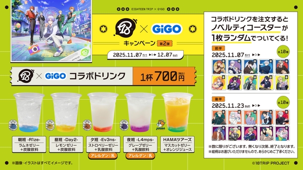 GiGOコラボカフェスタンドにて『18TRIP』の各班とHAMAツアーズをイメージしたコラボドリンクを販売いたします。