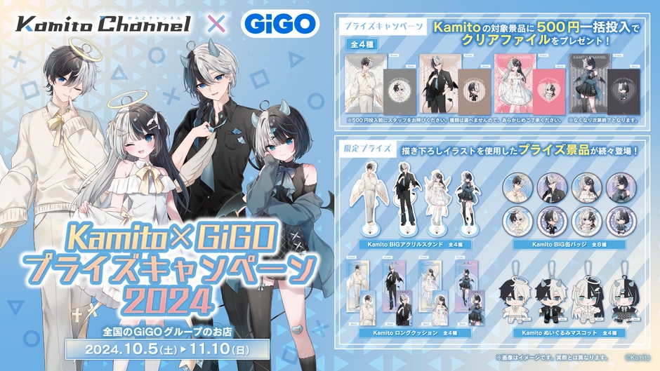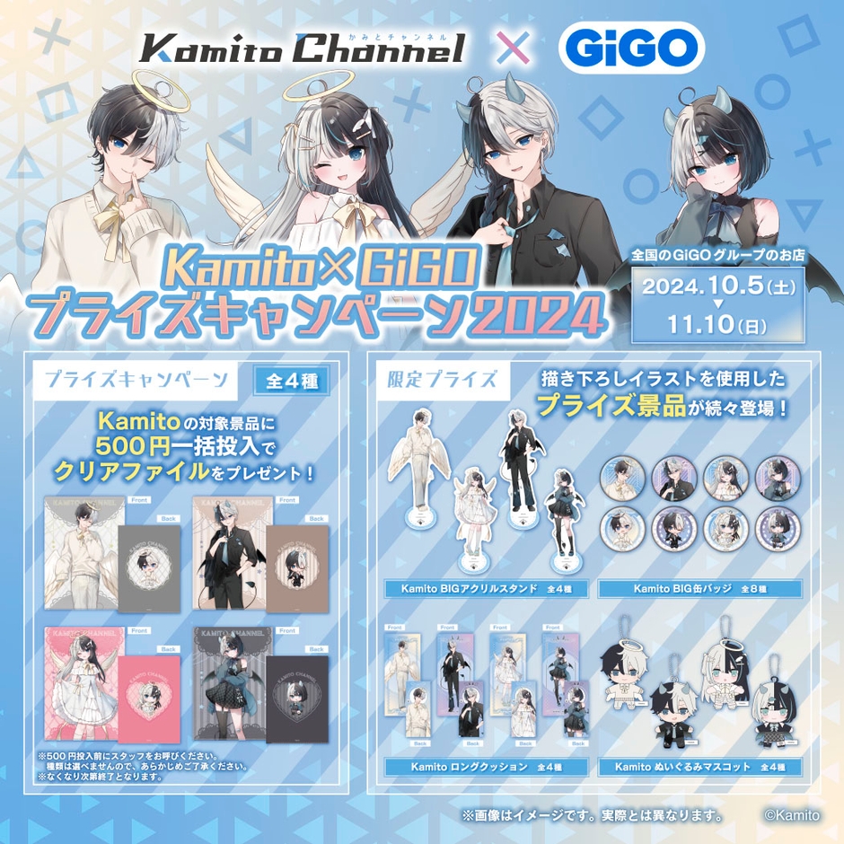 株式会社GENDA GiGO Entertainment(本社:東京都港区 代表取締役社長:二宮 一浩 以下当社)は GiGOグループのお店におきまして、人気ストリーマーであるKamito(かみと)さんとのコラボキャンペーンを2024年10月5日(土)より開催いたします。 本キャンペーンでは、イラストレーターのまゆふ氏描き下ろしイラストを使用した限定景品やコラボたい焼き、コラボポップコーンなど様々なコンテンツをご用意しております。