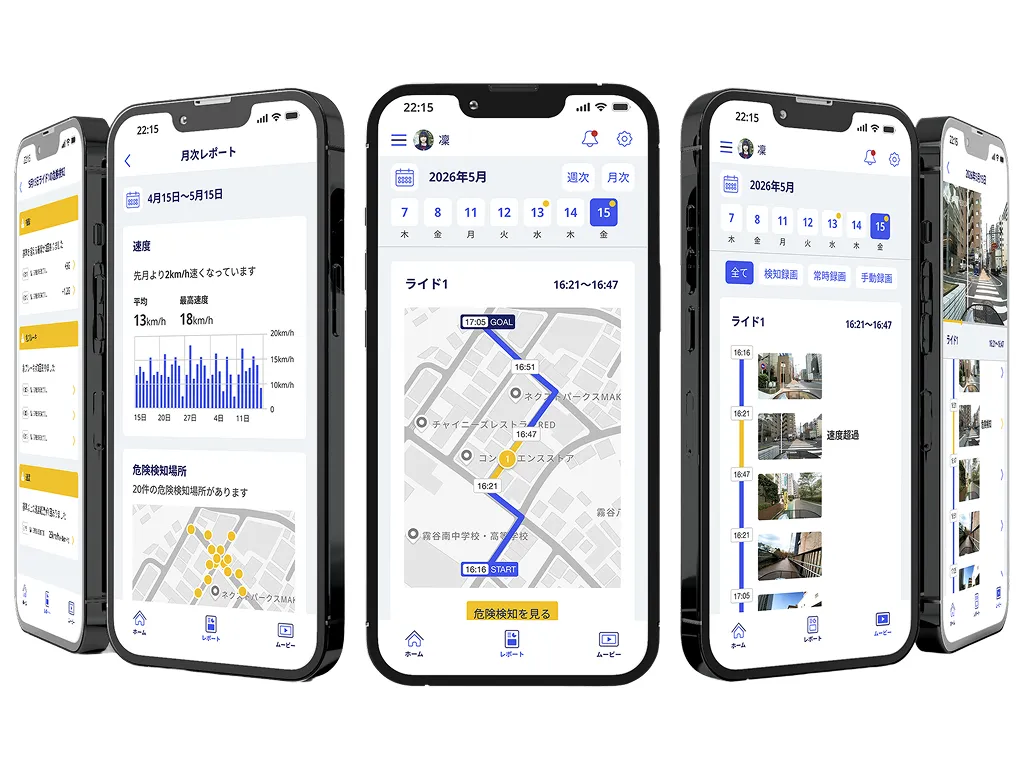 走行ログ、運転傾向、危険挙動、ヒヤリポイントをアプリ内で確認でき、
