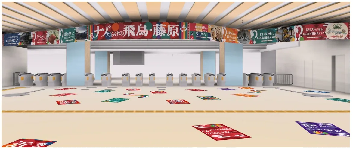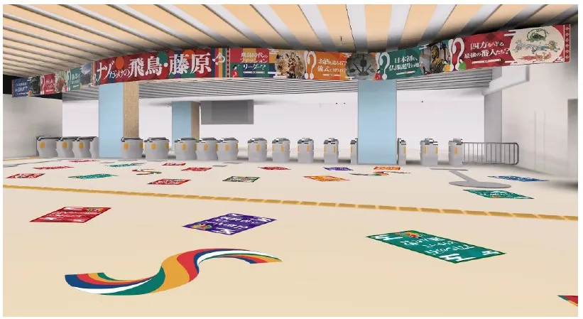 本装飾は、多くの「謎」に満ちた古代ロマンの魅力をアピールするため、飛鳥時代をイメージした華やかな色遣いで表現し、駅空間全体で「飛鳥・藤原」エリアへの想像や期待を膨らませていただける場所となっています。