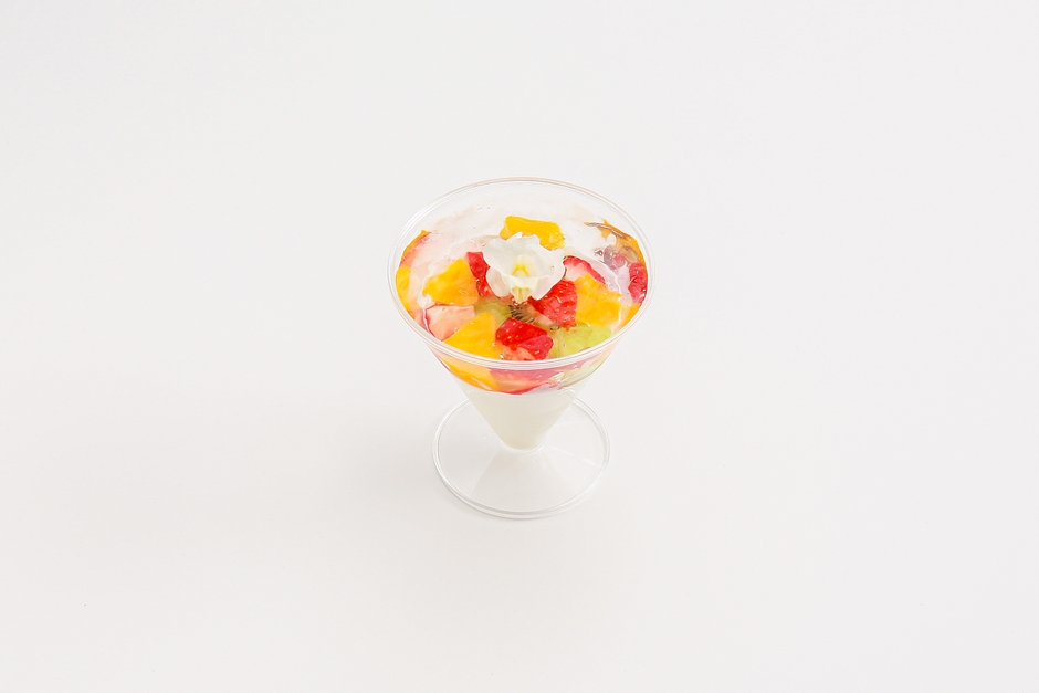 甘酒のムースにフルーツとライチジュレを合わせ、お花を飾りました。