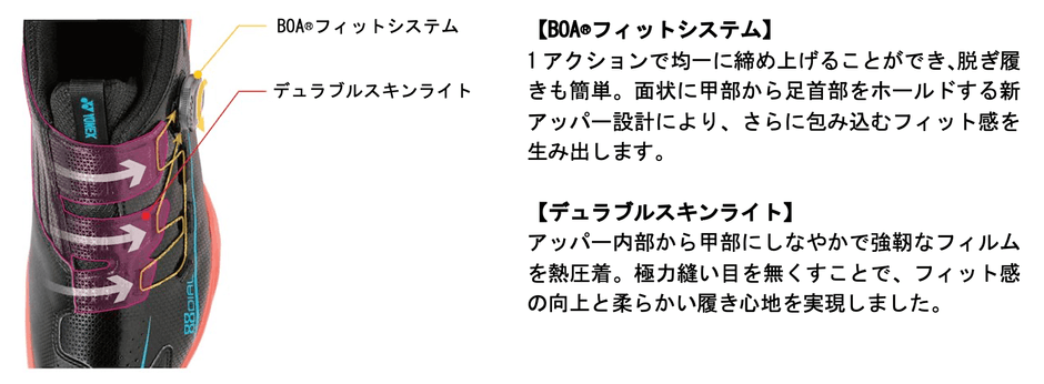 BOA®フィットシステム搭載で包み込むようなフィット感を実現し、素早く切り返せる高いグリップ性をも兼ね備えるバドミントンシューズが完成しました。