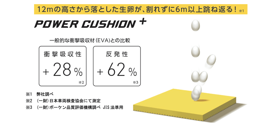 弊社独自の衝撃吸収性と反発性を併せ持つ衝撃吸収素材パワークッション。パワークッションに反発性の高い特殊樹脂を添加し、格子状に+型の溝を最適な間隔と深さで配置した新構造を採用した「パワークッション®プラス」は、従来の軽量性を保ちつつ、衝撃吸収性を28%※2、反発性を62%※3向上させ(一般的な衝撃吸収材[EVA]との比較)、12mの高さから落とした生卵が、割れずに6m以上跳ね返る新衝撃吸収反発素材です。