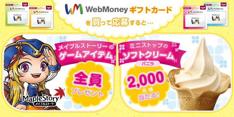 全国約2,148店(2015年2月現在)のミニストップ店舗にて、WebMoneyギフトカードをお買い求めいただき、キャンペーンページから応募いただくと、購入金額に応じて『メイプルストーリー』のゲーム内アイテムをもれなくプレゼントいたします。
