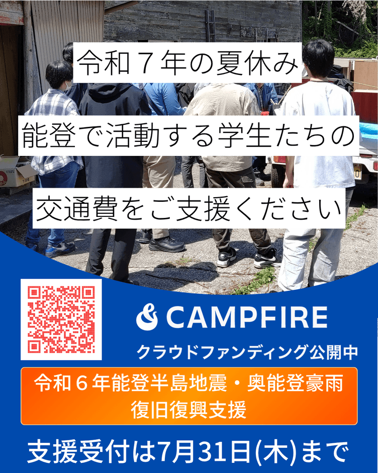 石川県能登半島で発生した地震や豪雨災害の復興支援に取り組む学生たちの交通費を支援するクラウドファンディングを、CAMPFIREにて2025年7月31日まで実施しています。