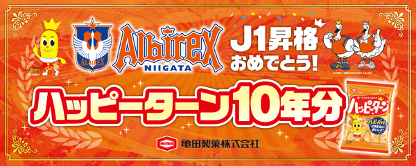 弊社は、「アルビレックス新潟」の前身である「アルビレオ新潟FC」が設立された1996年からユニフォームスポンサーを開始、「アルビレックス新潟」がJFLからJ2へ参入した1999年に胸スポンサーとなりました。2016~18年には、勝利を願う意味等を込めてロングセラー商品「ハッピーターン」をロゴに採用するなどを経て現在に至ります。
