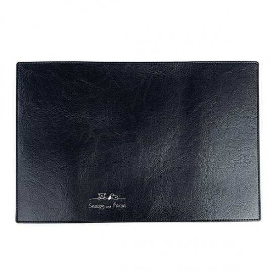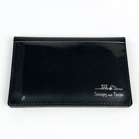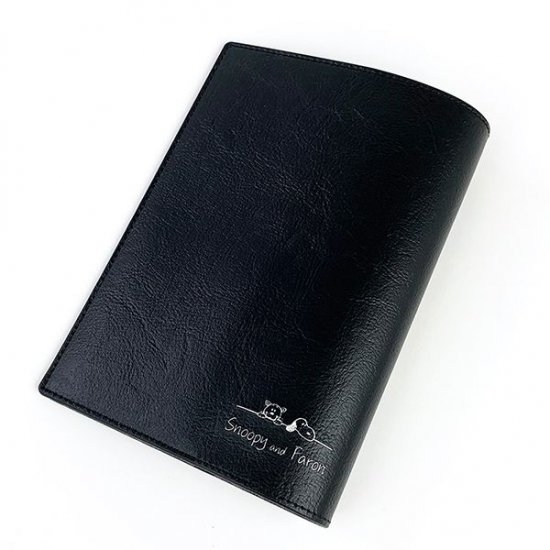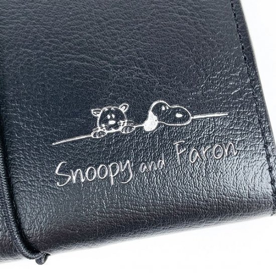 シックなブラックの合皮素材に、スヌーピーとファーロン、そしてロゴが箔押しされたケースです。箔押し部分はシルバーで、リッチ感もありますね。あえてゴールドではなくシルバーをチョイスするあたり、スタイリッシュで素敵です♡