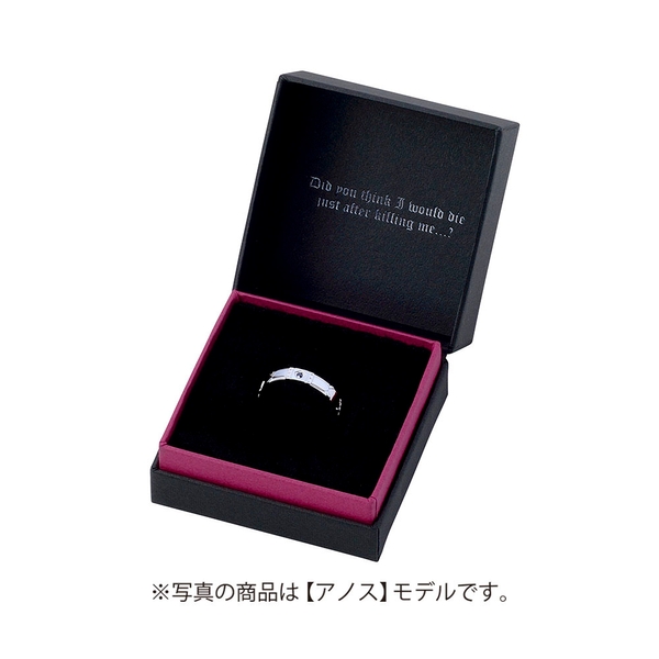 TVアニメ「魔王学院の不適合者」に登場するアノス・ヴォルディゴードをイメージしたリングです。表面は魔王学院の制服を取り込み、イメージカラーストーンをセット。内側にはアノスの校章と名前刻印を施しました。ユニセックスに身につけられる、平打ちフォルムのデザインです。