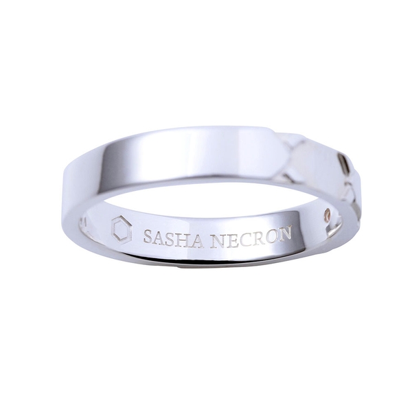 TVアニメ「魔王学院の不適合者」に登場するサーシャ・ネクロンをイメージしたリングです。表面は魔王学院の制服を取り込み、イメージカラーストーンをセット。内側にはサーシャの校章と名前刻印を施しました。ユニセックスに身につけられる、平打ちフォルムのデザインです。