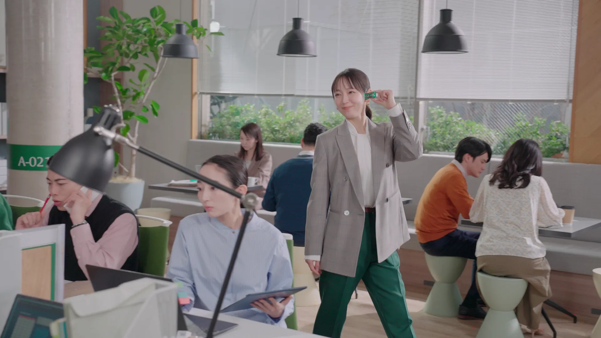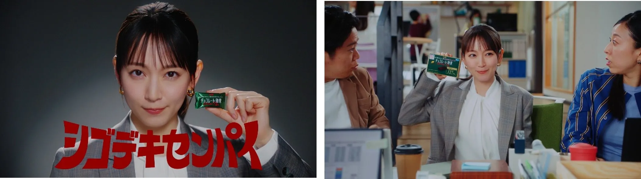 何事もタイパ・コスパ重視のバリキャリ・シゴデキセンパイが、チョコレート効果は仕事中の“おやつ”ではなく“必需品”であることを社員に力説します。仕事をこなしながら、集中力を切らした社員たちにいつの間にかチョコレート効果をお届けするシゴデキっぷりを、スーツ姿の吉岡さんがメリハリのある表情で演じます。
