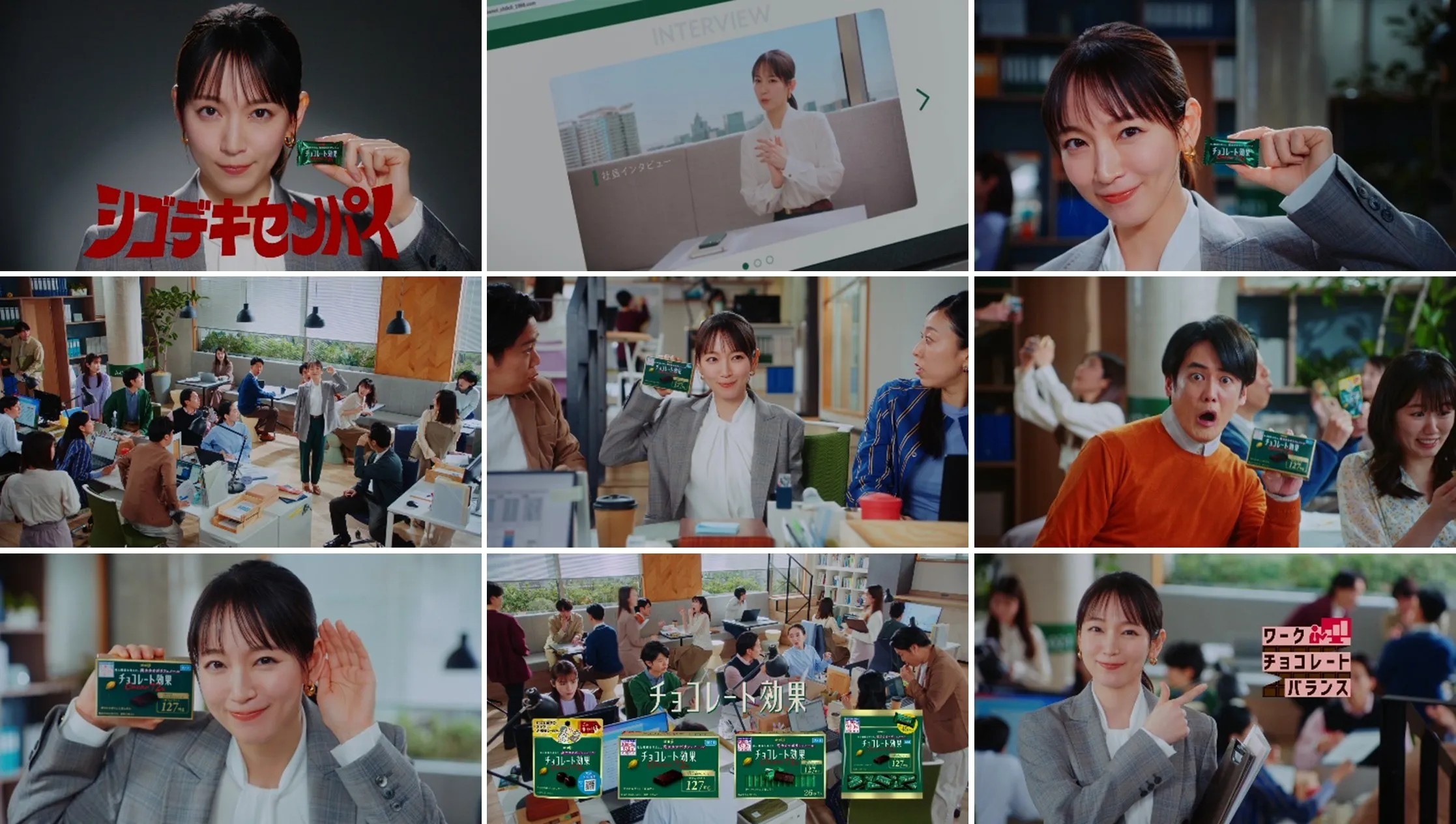 本CMでは、吉岡里帆さんがいつも定時までに仕事を終わらせて帰る「シゴデキセンパイ」を演じ、チョコレート効果は仕事中の“おやつ”ではなく“必需品”であることを社員に力説する様子を描きます。テキパキとしながらも、後輩思いな一面をのぞかせる吉岡さんの優しい表情は必見です。当社は、本CMを通して、仕事や学習、作業など、「ワーク」に向き合う時間に高カカオチョコレートを取り入れ、日々のコンディション管理をサポートする新習慣「ワークチョコレートバランス」を提案します。