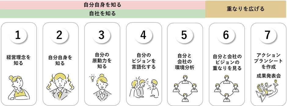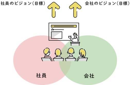 この講座は、企業で働く社員に対し、社員自身のビジョンをまずは明確にし、会社のビジョンとの接点を見つけていくことで、仕事のやりがいに繋げていくことを行います。ビジョンの重なりを広げ、仕事を楽しいものに変換していくことで、社員も企業も成長していくことを目指します。