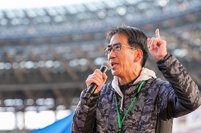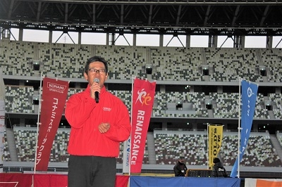 「この『超スポーツクラブ!ファンランリレー』は初めての試みです。それを陸上競技の聖地・国立競技場で開催できること、また皆さまの今日の笑顔を我々一同大変嬉しく思っています。これ以上ない晴天に恵まれた今日、皆さまケガ無く、楽しくゴールしてください!」