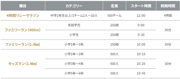 中学生以上を対象に、10人までのチームで行うリレー形式のマラソン。1周約1.4kmのコースを何周目で交代してもよく、また1人が何度走ってもよいというルールのもと、4時間たすきを繋ぎ続けます。202組のエントリーの中から、より多くの周数を完走した上位3チームが表彰されました。参加者からは「やり切った!出し切った!楽しかった!!」(30代男性)「久しぶりに走ったらこんなにツラいんだと思った。でも気持ちいい~~!」(30代女性)や、「チームで4回くらい練習会をやって臨みましたが、今日はテンションが上がり、みんな練習以上のチカラが出せています。最高の気分!チームのメンバーは口々に『出なかった人はもったいない』と言っています」(出場スポーツクラブの支配人)などと話していました。