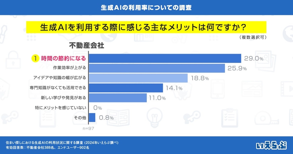 すでに生成AIを利用している不動産会社(※)にメリットを尋ねたところ、「時間の節約になる」(29.0%)が最も多く挙げられ、次に「作業効率が上がる」(25.9%)という結果になりました。