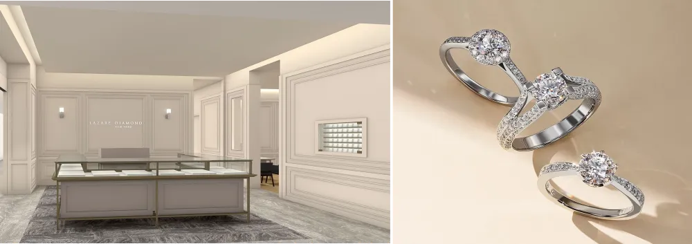 「ラザール ダイヤモンド ブティック」は、ニューヨーク発のダイヤモンドカッティングブランドである「ラザール ダイヤモンド」を取り扱う専門店として、日本国内の大都市を中心に15店舗を展開しています。新店舗では、「ラザール ダイヤモンド」が誇る「伝統」「品質」「信頼」に、現代的な感性や時代のトレンドを融合させた新デザインを採用。フロア全体を使ったゆとりある上質な空間で、”The World’s Most Beautiful Diamond(世界で最も美しいダイヤモンド)“をご覧いただけるほか、気軽に商品をご覧になりたいお客様のニーズにもお応えいたします。